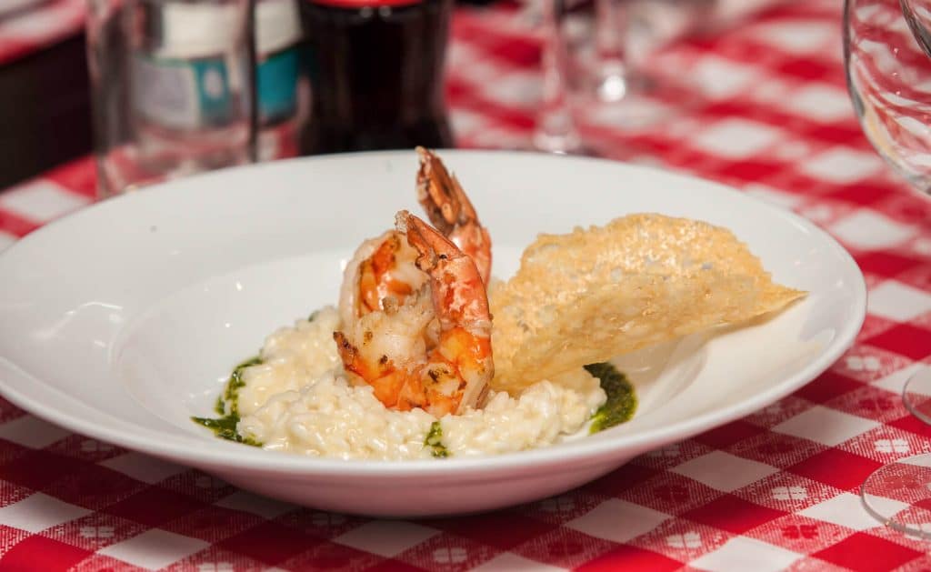 Nicolai ne-a aratat cum sa curatam crevetii, tocam ceapa si ne-a dat toate indicatiile cum sa facem un risotto delicios. La final fiecare si-a pus in farfurie, si-a decorat-o dupa cum a dorit cu creveti, pesto de busuioc si parmezan.