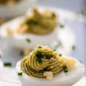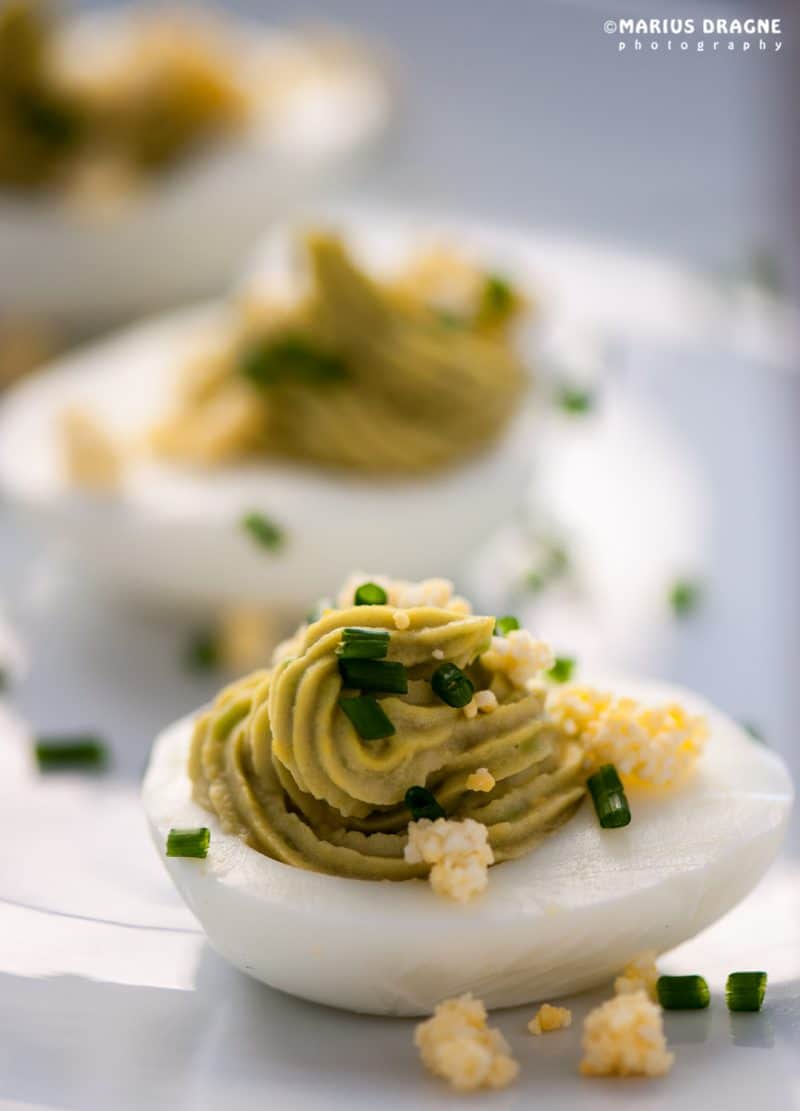 - Amestecam cu un blender galbenusurile, avocado, usturoiul si uleiul asezonand dupa gust cu sare si piper. Cu o lingurita sau cu o seringa/punga de ornat punem crema obtinuta in jumatatile de ou.
