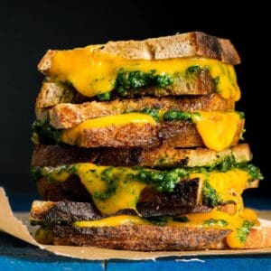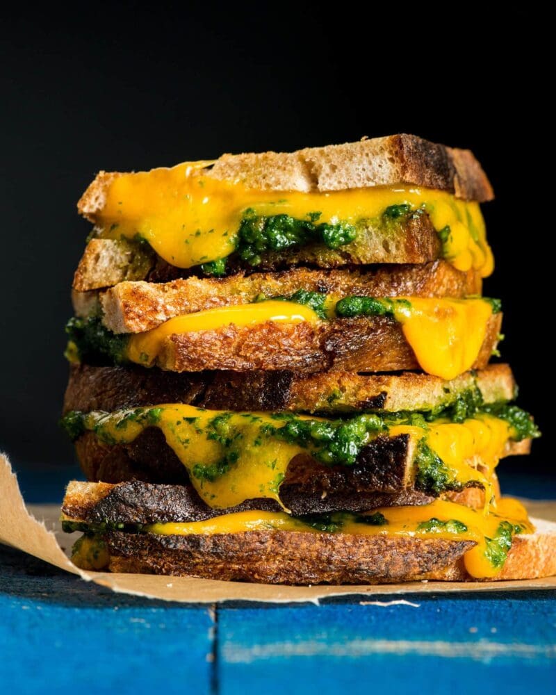 Sandwich cu paine prajita, un pesto de leurda si branza Cheddar, cald si delicios. Bun la micul dejun, ca un aperitiv la o petrecere sau chiar si la un picnic.