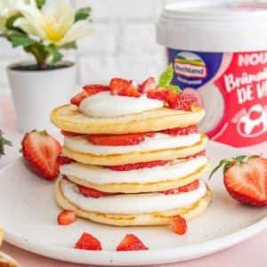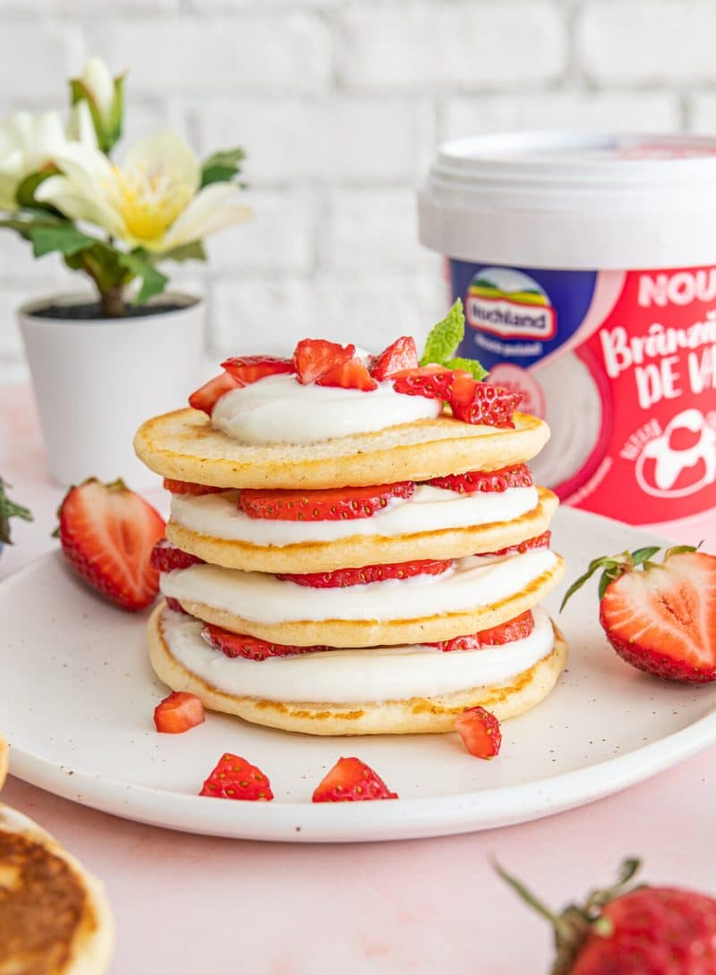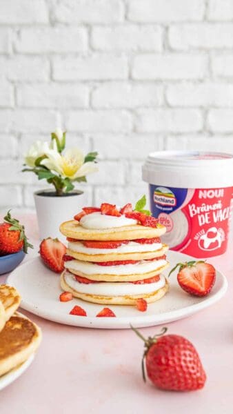 Mic dejun delicios ca un rasfat, cu pancakes pufoase, branza de vaci cremoasa si capsuni.