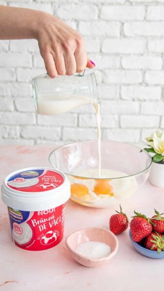 - Într-un alt bol, cu ajutorul unui mixer bate brânza de vaci cu ouăle, zahărul, vanilia și laptele. Adaugă mixul de făină și amestecă până la omogenizare. Lasă compoziția să respire 5 minute.