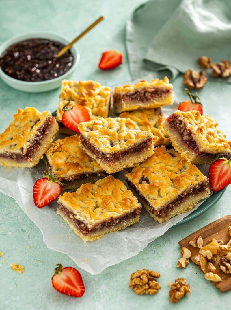 - Maruntim nuca si o amestecam cu dulceata folosita. Turnam amestecul peste blatul copt si dam restul de aluat congelat pe razatoare deasupra stratului de dulceata.