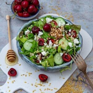 Cu aceasta salata profit la maxim de ciresele dulci din sezon. La fel ca cele mai multe salate, este foarte usor de facut si foarte satioasa (si Marius confirma). Iar voi puteti profita de codul „delicii” la orice comanda pe www.sanovita.ro pentru 15% discount!