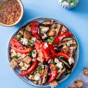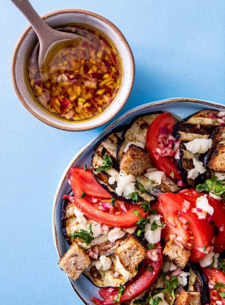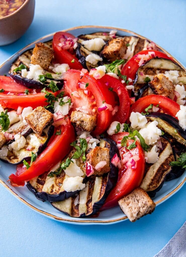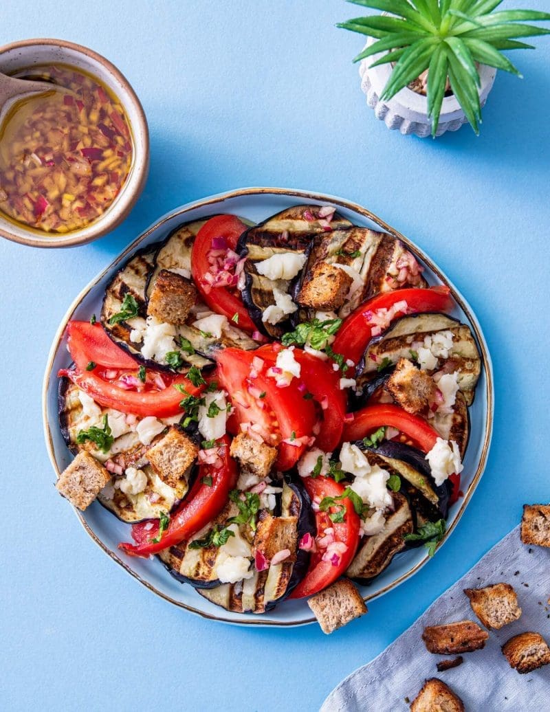 Cu gandul la zile cu mai mult soare si la rosiile „alea bune”, va propun o salata destul de simpla, dar delicioasa si satioasa. Vedeta este combinatia de gust senzatie intre vinete coapte, rosii, branza de burduf si un dressing pe masura.