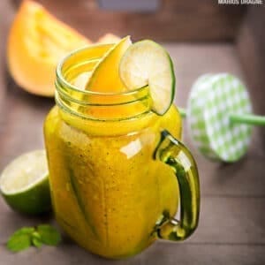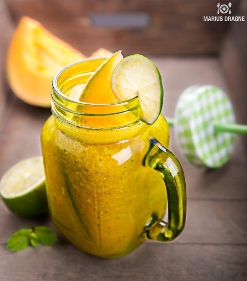 - Intr-un blender punem bucatile de pepene desprinse de pe coaja, frunzele de menta, sucul de lamaie si apa. Blenduim bine compozitia si la final gustam si potrivim gustul cu miere.
