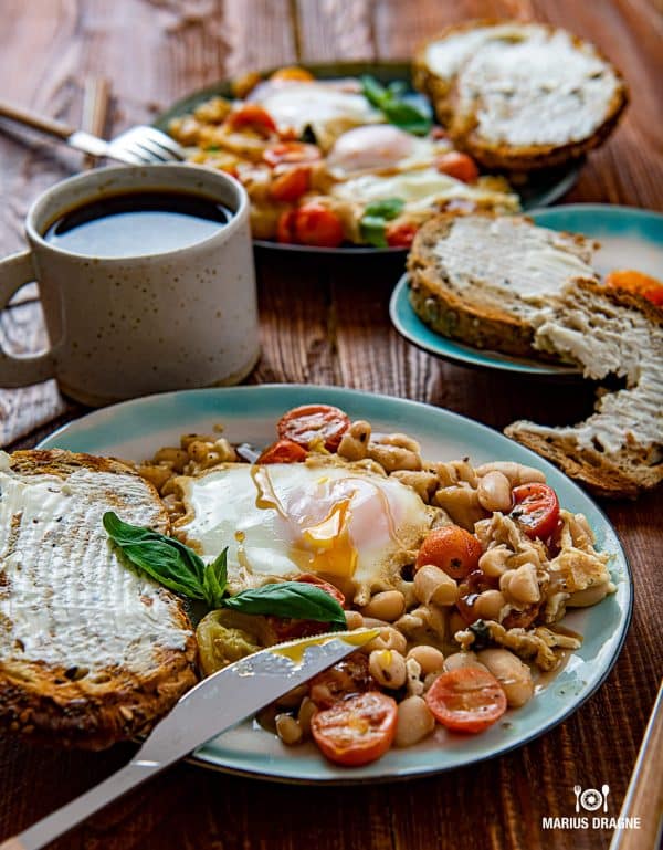 Mic dejun cu oua, fasole si rosii cherry
