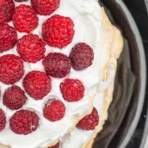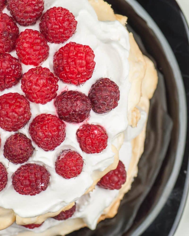 - Batem frisca lichida impreuna cu extractul de vanilie sau lichiorul. Punem forma de bezea mai mare pe un platou, intindem un strat de frisca si unul de zmeura. Asezam deasupra forma de bezea mai mica si continuam cu frisca ramasa si zmeura.
