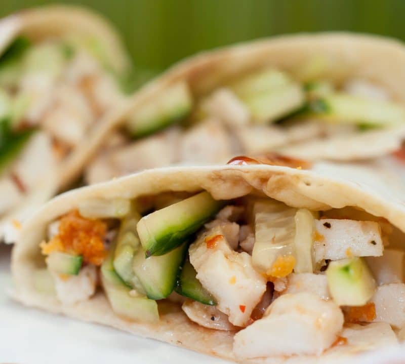 - Incalzim tortillas intr-o tigaie de teflon, pe fiecare parte, pana ce isi schimba usor culoarea. Stropim cu cele doua sosuri tortillas incalzite, aranjam batoanele de castravete si cubulete de crab si impachetam. Servim imediat.